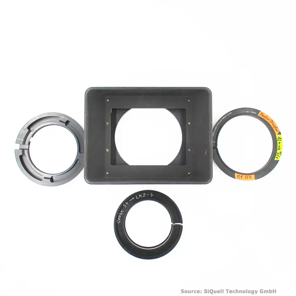 Included are three reduction rings from 156 mm to 134 mm, 114 mm, and 110 mm. This lightweight matte box is therefore suitable for ALURA Studio Zooms 18-80 and 45-250 mm, Master Primes, and Cooke S4 lenses, for example.