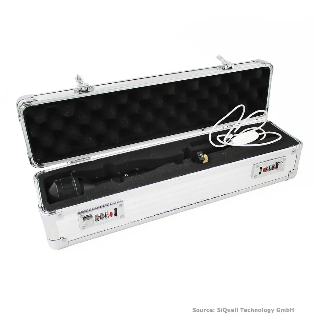Supplied in an aluminum case with combination lock, incl. USB cable and padded carrying bag with handle and shoulder strap.